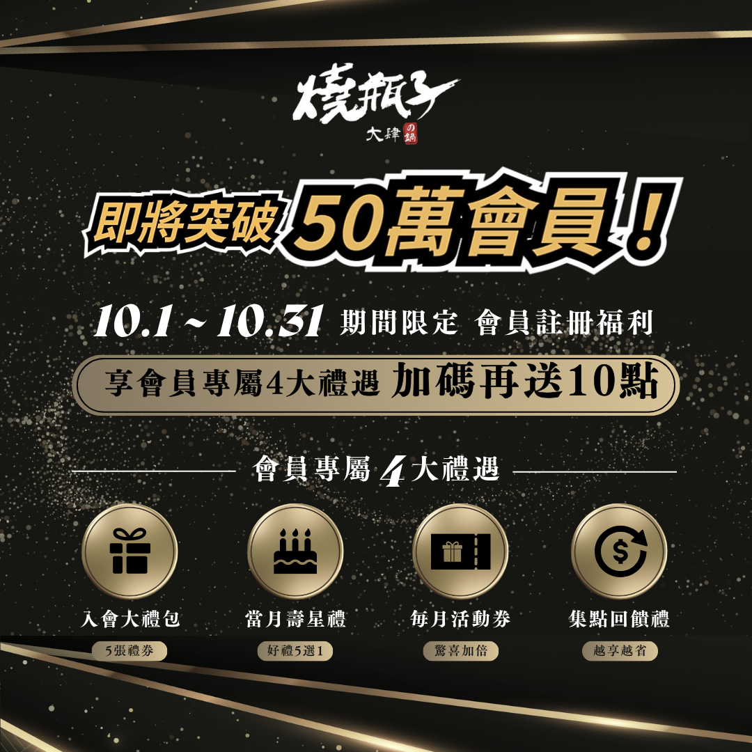 🎉燒瓶子會員數即將突破50萬🎉 10月限定‼️新會員加碼送10點‼️ 現在就是成為尊榮會員的最佳時刻✨ http://ocard.co/A?sid=xPnNWZ 立即加入,即享專屬『四大禮遇』 ✔️ 入會大禮包|5張禮券一次到手🎁 ✔️ 生日壽星禮|5選1,專屬你的驚喜🎂 ✔️ 每月活動券|不錯過任何優惠📅 ✔️ 消費集點換好禮|越吃越划算🎯 🚀 10月限定加碼:加入會員再送點數10點❣️ 🚀 50萬會員慶典:突破50萬會員,解鎖VIP專屬驚喜福利❣️